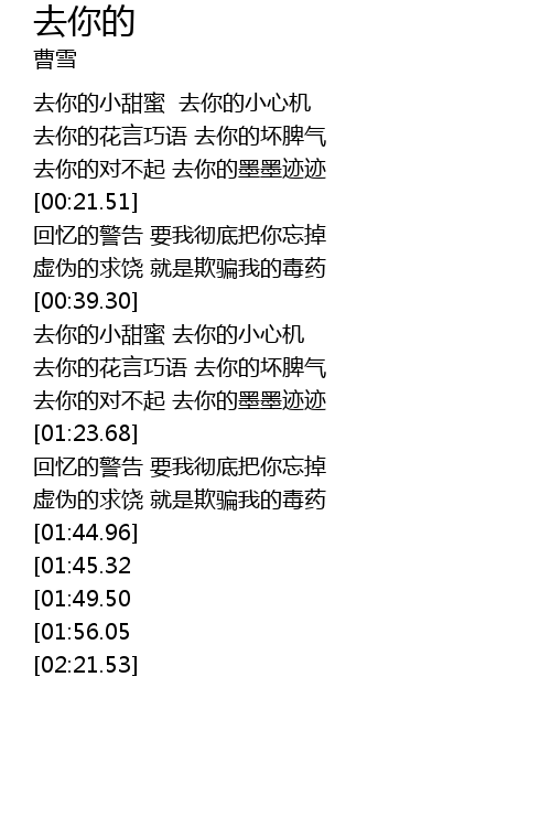 | [00:39.90] | 去你的小甜蜜 去你的小心机 |