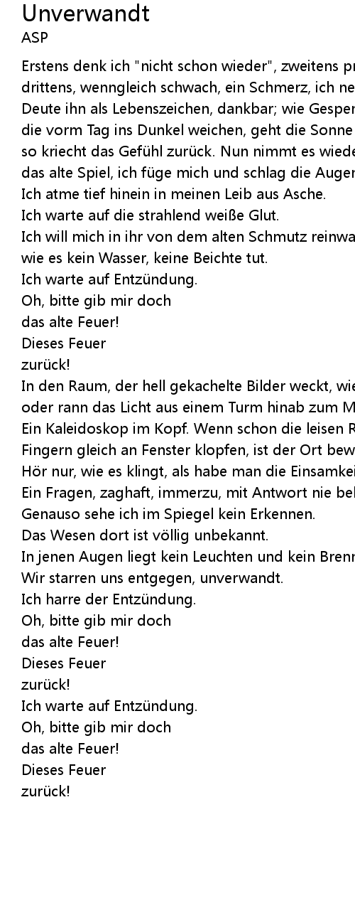 | Ich atme tief hinein in meinen Leib aus Asche. | |