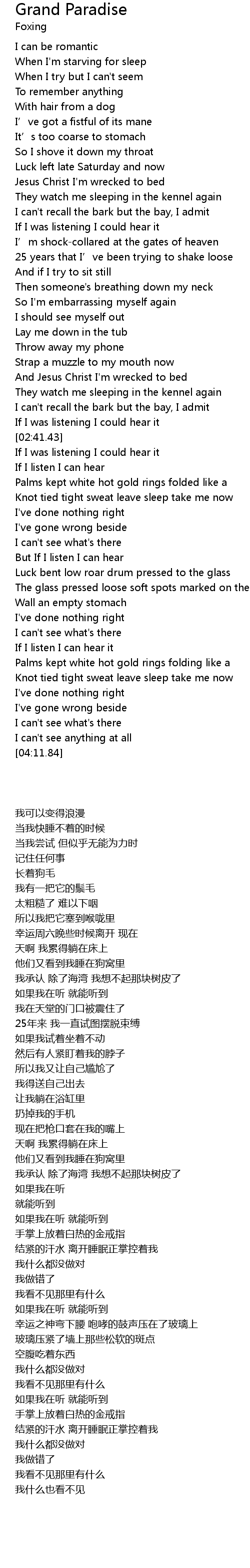 | [03:54.54] | Knot tied tight sweat leave sleep take me now |