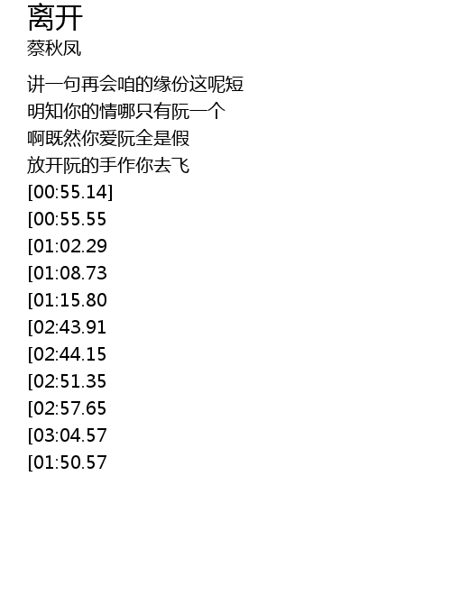 | [03:14.69][02:44.15][01:22.62] | 离开我袂离开 离开有你的城市 |