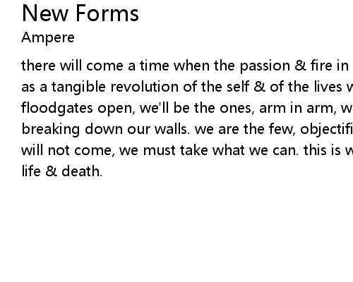 | there will come a time when the passion & fire in our words will manifest itself as a tangible revolution of the self & of the lives we're living. and when those floodgates open, we'll be the ones, arm in arm, wielding words as weapons, breaking down our walls. we are the few, objectified & marginalized. our time will not come, we must take what we can. this is what we've become. we are both life & death. |
