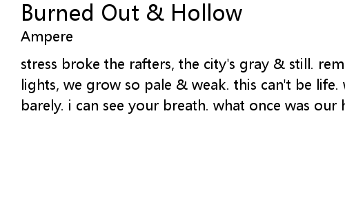 | stress broke the rafters, the city's gray & still. removed from the bright lights, we grow so pale & weak. this can't be life. we are breathing, but barely. i can see your breath. what once was our home is now our grave. |
