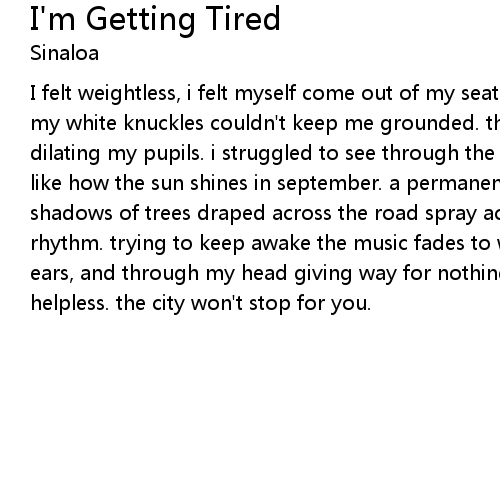 I felt weightless, i felt myself come out of my seat. as i held the wheel tight, my white knuckles couldn't keep me grounded. the cold air blows in my eyes. dilating my pupils. i struggled to see through the hazy air. the air seems thick like how the sun shines in september. a permanent dusk and perpetual defeat. shadows of trees draped across the road spray across my eyes in a syncopated rhythm. trying to keep awake the music fades to wind. the wind blows past my ears, and through my head giving way for nothing else, deafening. distracted and helpless. the city won't stop for you. |