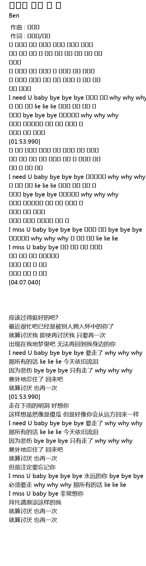 | [03:30.850] | I miss U baby bye 너무 많이 보고 싶어요 |