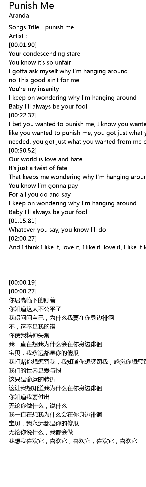 | [00:23.31] | I bet you wanted to punish me, I know you wanted to punish me, feels like you wanted to punish me, you got just what you wanted, I got just what I needed, you got just what you wanted from me oh Lord, and I think I like it |