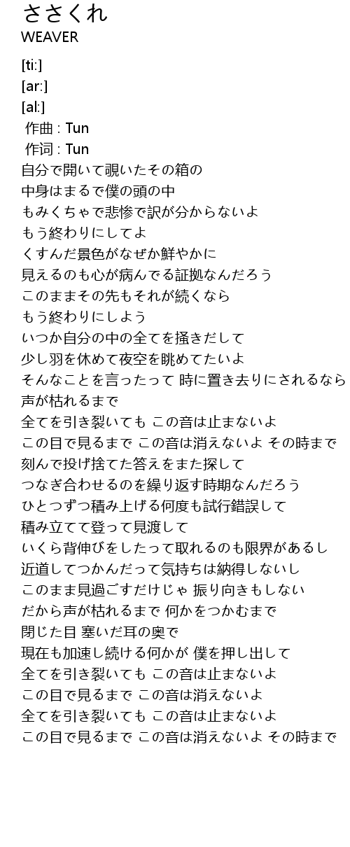 | [03:50.64] | 全てを引き裂いても この音は止まないよ |