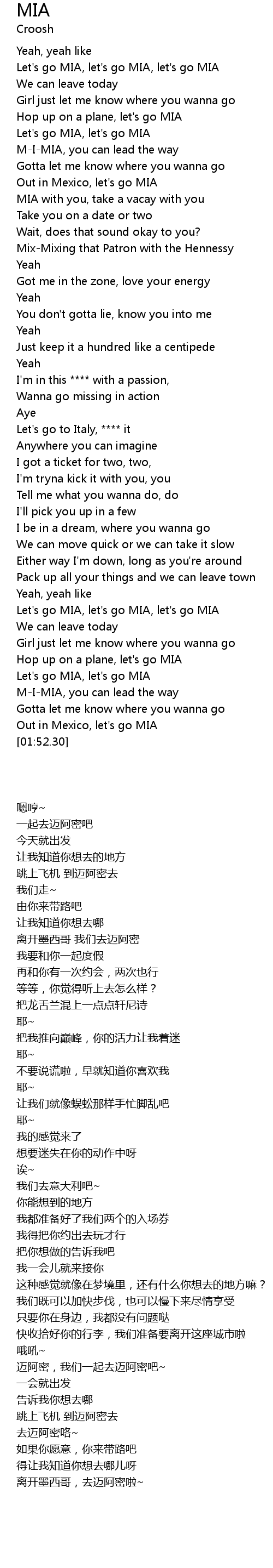| [01:25.14] | Let's go MIA, let's go MIA, let's go MIA |