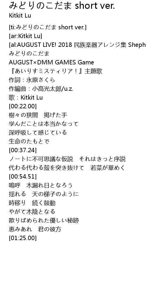 | [00:04.00] | AUGUST×DMM GAMES Game 『あいりすミスティリア!』主題歌 |
