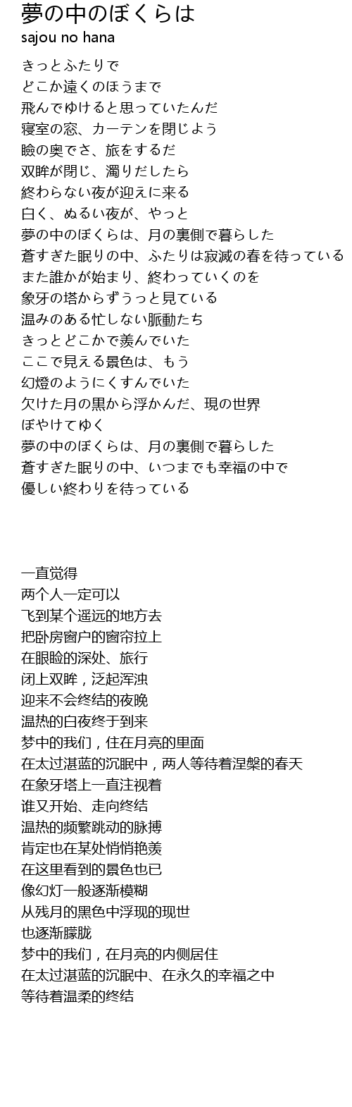 | [02:39:720] | 夢の中のぼくらは、月の裏側で暮らした |