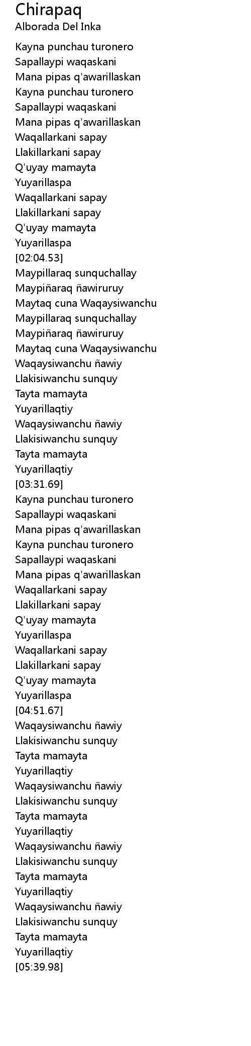 | [05:06.73] | Waqaysiwanchu ñawiy |