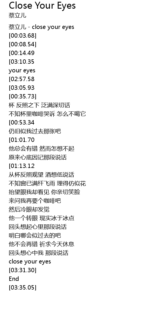 | [03:18.63][03:10.35][03:01.79][02:53.25][02:02.70][01:53.70][00:25.36][00:17.01] | close your eyes |
