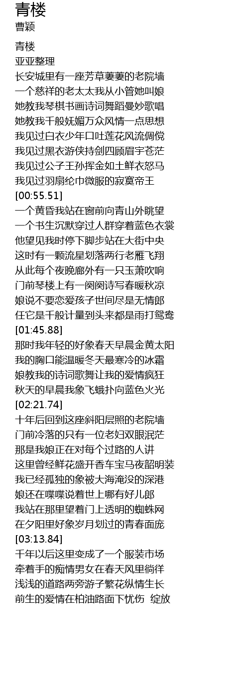 | [00:18.28] | cháng ān chéng lǐ yǒu yī zuò fāng cǎo qī qī de lǎo yuàn qiáng |