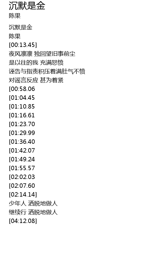 | [03:26.03][01:42.07] | 始终相信沉默是金 |