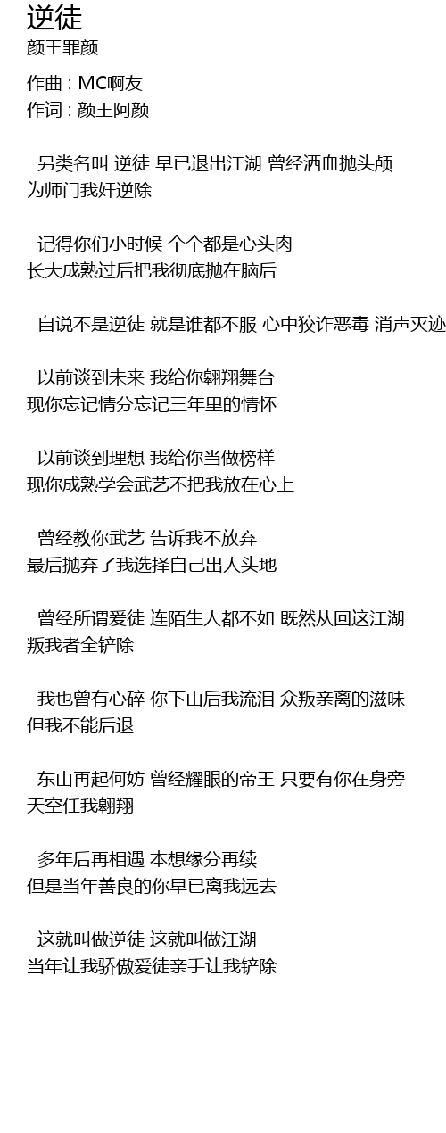 | 另类名叫 逆徒 早已退出江湖 曾经洒血抛头颅 为师门我奸逆除 | |