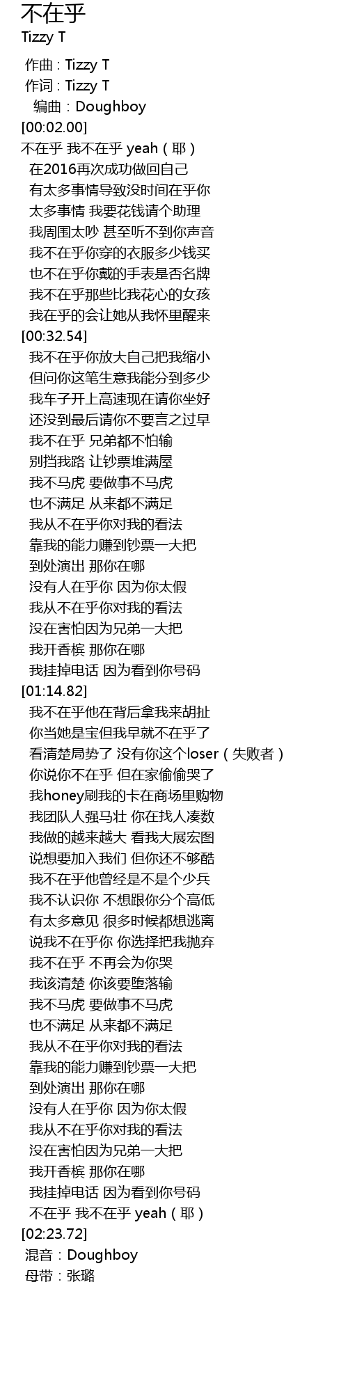 | [02:21.72] | bu zai hu wo bu zai hu yeah ye |