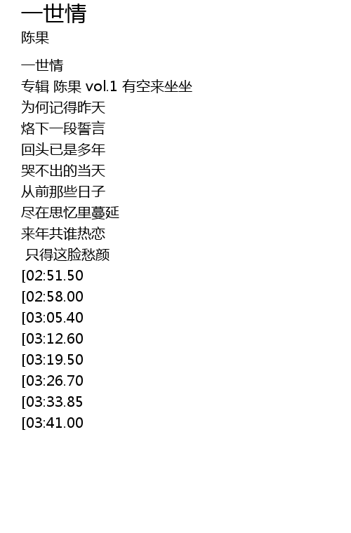 | [01:26.55][02:51.50] | 一世情 忘不了 |