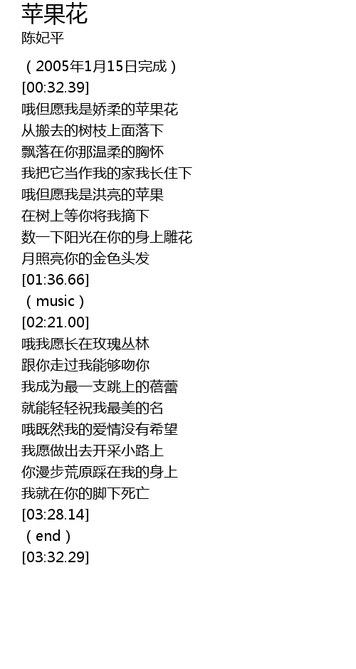 | [00:33.39] | 哦但愿我是娇柔的苹果花 |