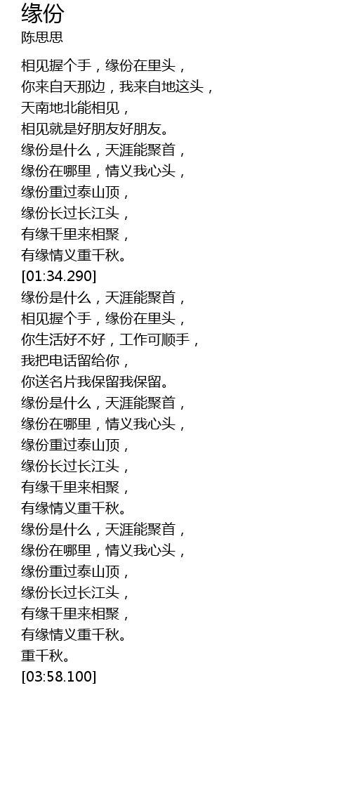 | [01:43.010] | 缘份是什么,天涯能聚首, |