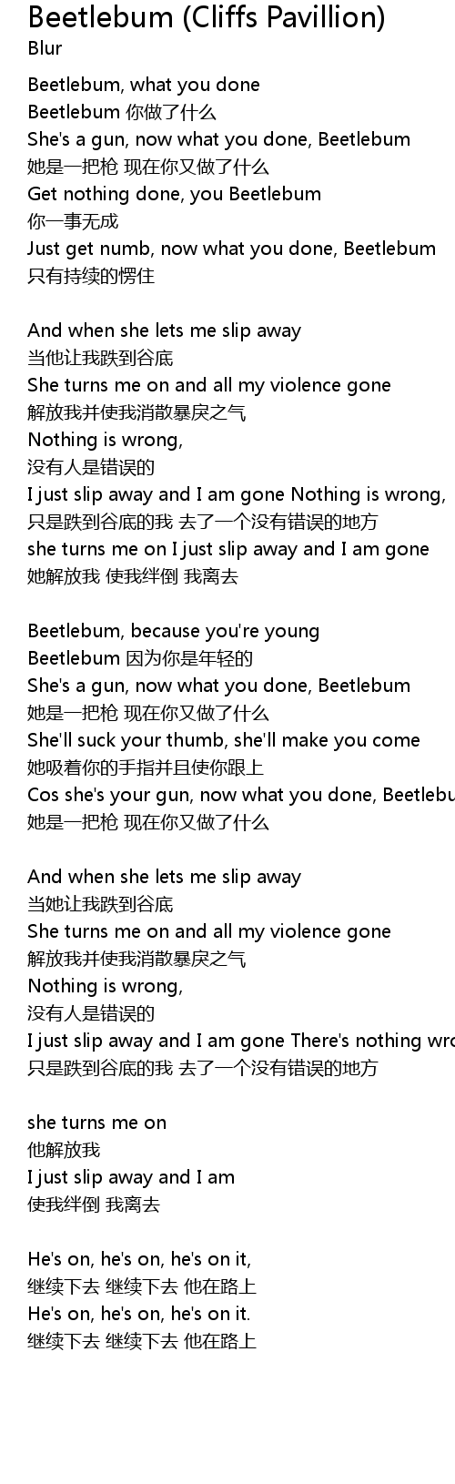 | Cos she's your gun, now what you done, Beetlebum | |