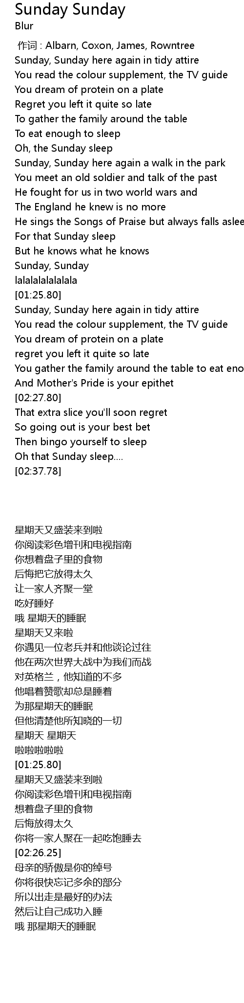 | [02:11.39] | Sunday, Sunday here again in tidy attire |