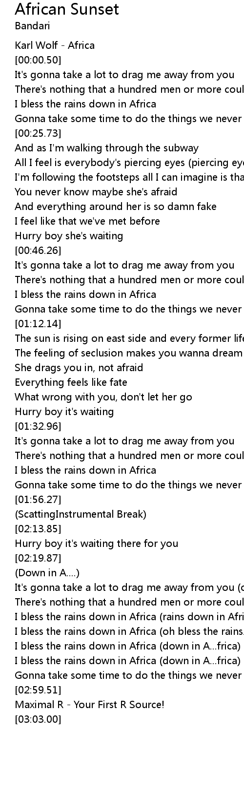 | [02:47.31] | I bless the rains down in Africa (down in A...frica) |