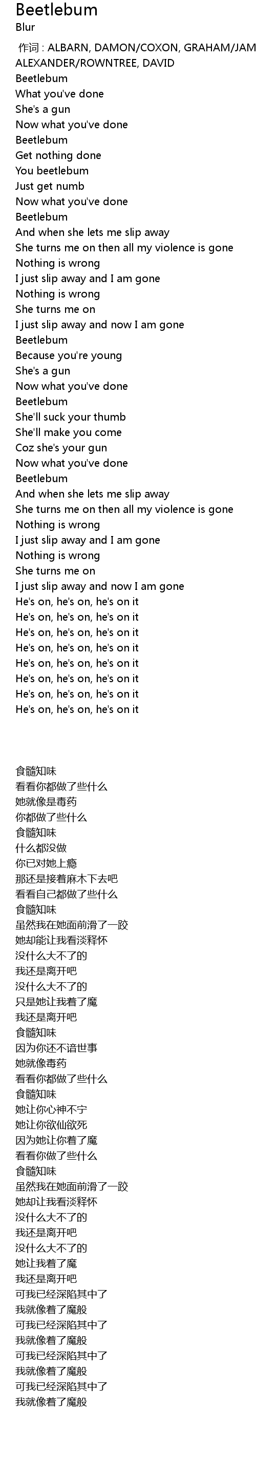 | [00:00.00] | 作词 : ALBARN, DAMON/COXON, GRAHAM/JAMES, STEVEN ALEXANDER/ROWNTREE, DAVID |