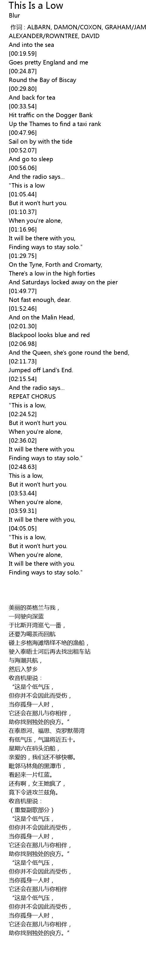 | [00:00.00] | 作词 : ALBARN, DAMON/COXON, GRAHAM/JAMES, STEVEN ALEXANDER/ROWNTREE, DAVID |
