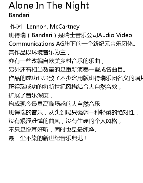 | [01:13.82] | 作品的成功也导致了不少盗用版班得瑞乐团名义的唱片出现。 |