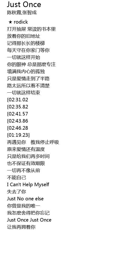 | [02:55.14][02:35.82][01:50.24][01:02.23] | Just Once yì qǐ huí yì guò qù |
