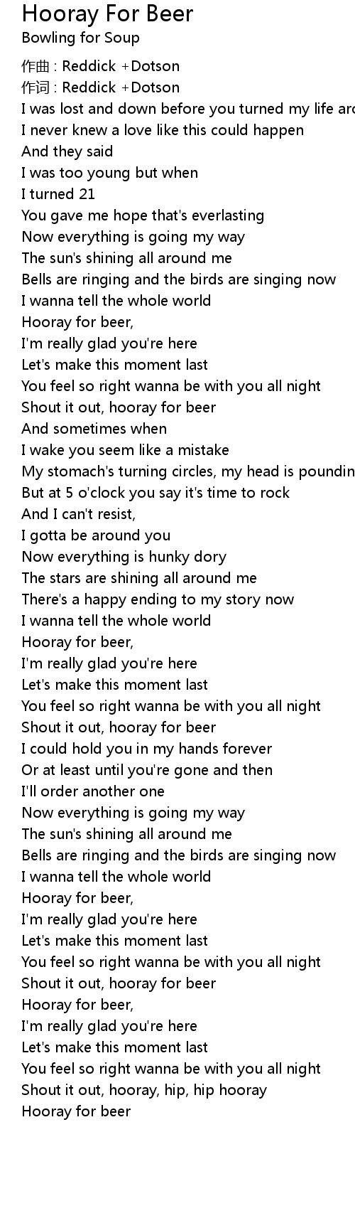 | Hooray for beer, | |