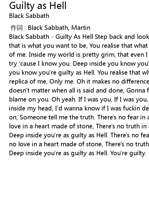 | [00:08.57] | Black Sabbath - Guilty As Hell Step back and look at you, and tell me that is what you want to be, You realise that what you're seeing, is a replica of me. Inside my world is pretty grim, that even I can't survive in, I wouldn't try 'cause I know you. Deep inside you know you're guilty as Hell. Deep inside you know you're guilty as Hell. You realise that what you're seeing is just a replica of me, Only me. Oh it makes no difference if you're the only one, It doesn't matter when all is said and done, Gonna feel the same, God will put the blame on you. Oh yeah. If I was you, If I was you, I'd wanna see, I'd wanna see inside my head, I'd wanna know if I was fuckin dead, I'd wanna know what's going on, Someone tell me the truth. There's no fear in a fallen Angel, there's no love in a heart made of stone, There's no truth in a heart that is screaming, Deep inside you're as guilty as Hell. There's no fear in a fallen Angel, there's no love in a heart made of stone, There's no truth in a heart that is screaming. Deep inside you're as guilty as Hell. You're guilty. |