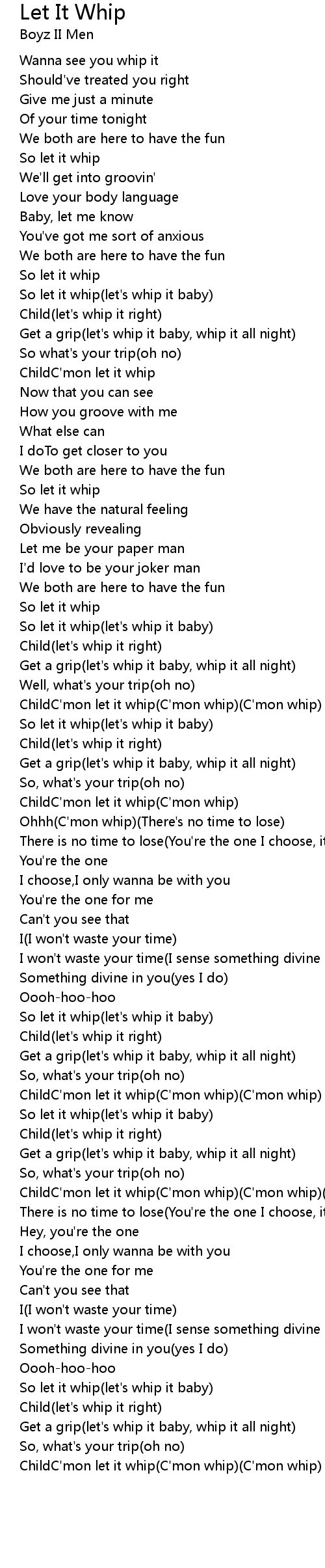 ChildC'mon let it whip(C'mon whip)(C'mon whip)(There's no time to lose) |