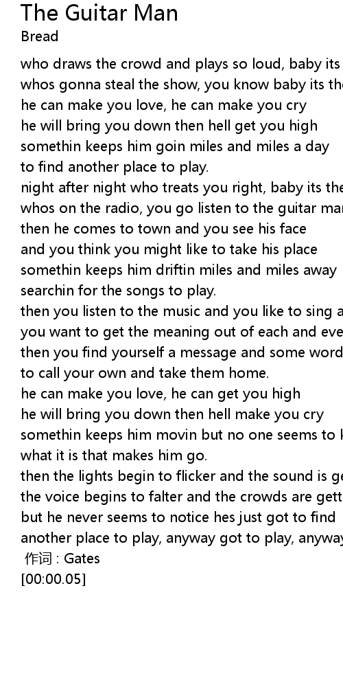 | [00:13] | who draws the crowd and plays so loud, baby its the guitar man |