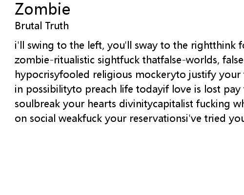| i'll swing to the left, you'll sway to the rightthink for yourself, zombie-ritualistic sightfuck thatfalse-worlds, false wordsfuels religions hypocrisyfooled religious mockeryto justify your treasonobey, you preythe hope in possibilityto preach life todayif love is lost pay the costbleed your fucking soulbreak your hearts divinitycapitalist fucking whoreopen cash proceureto prey on social weakfuck your reservationsi've tried your fantasies |