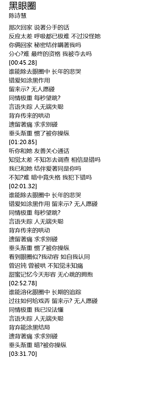 | [02:35.76] | 看到眼圈似?我动容 如自我认同 |