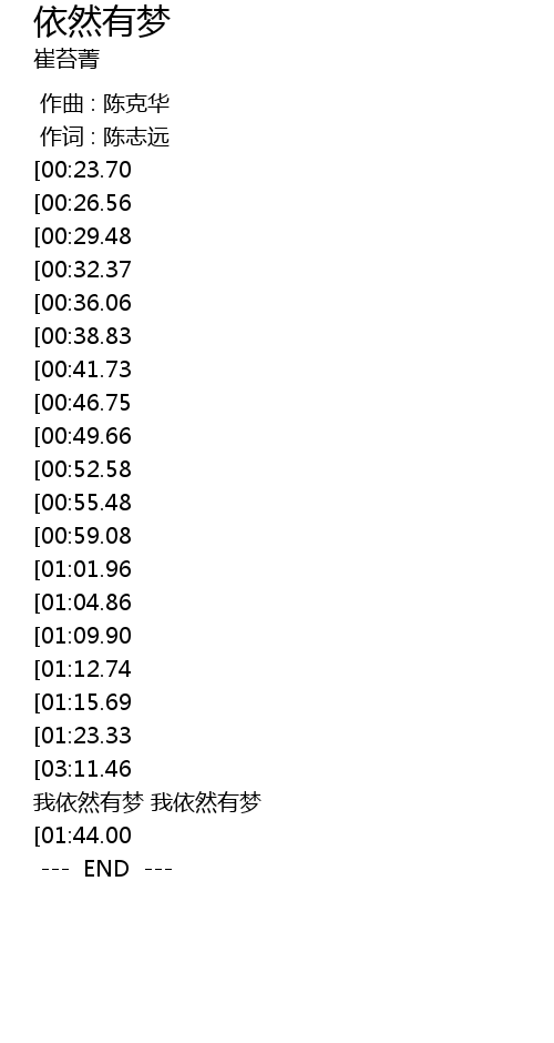 | [03:18.68][03:11.46][03:04.23][02:56.98][01:35.99][01:28.73] | 啊~~ 我依然有梦 我依然有梦 |