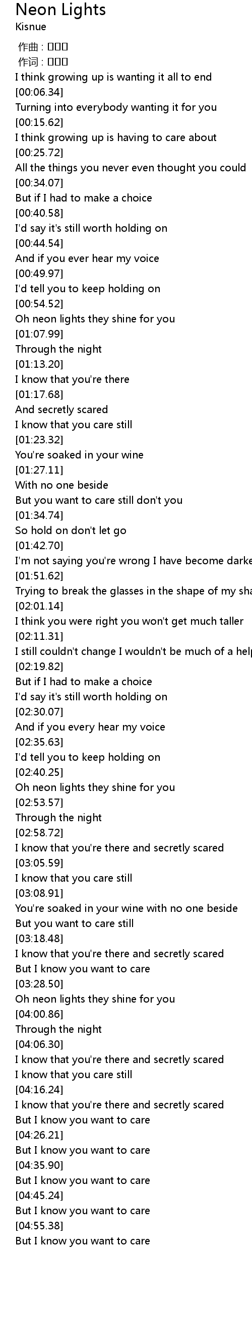 | [02:43.61] | Oh neon lights they shine for you |