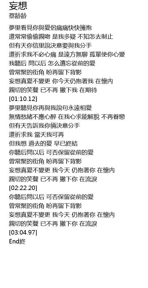 | [02:05.03] | 妄想真愛不變更 我今天 仍抱著你 在懷內 |
