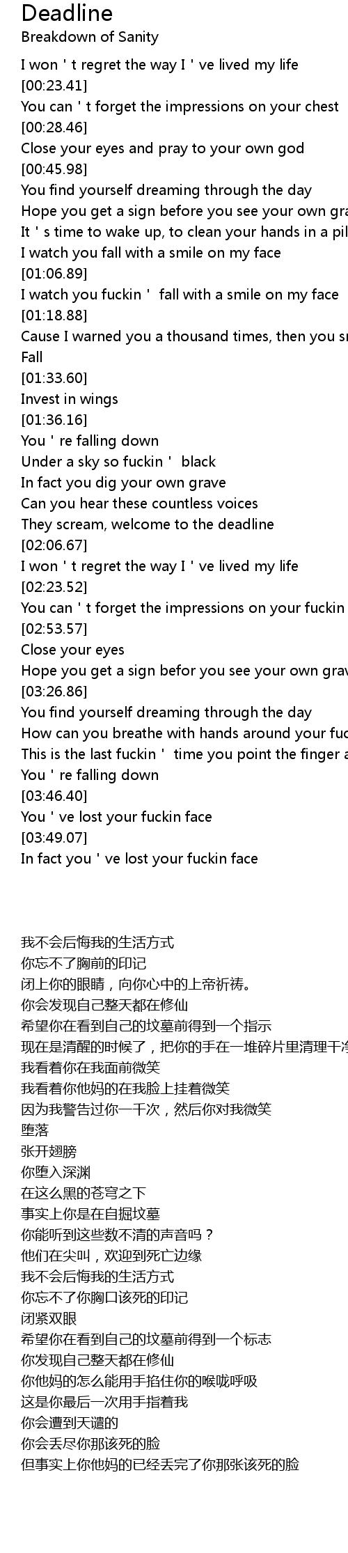 | [02:03.86] | They scream, welcome to the deadline |