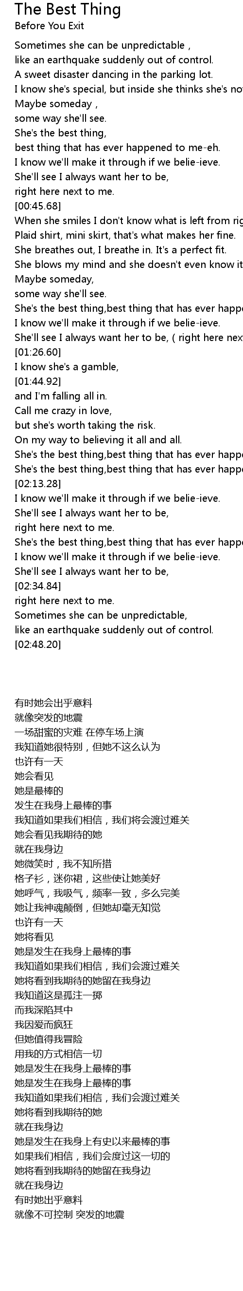 | [02:22.44] | She' s the best thing, best thing that has ever happened to meeh. |