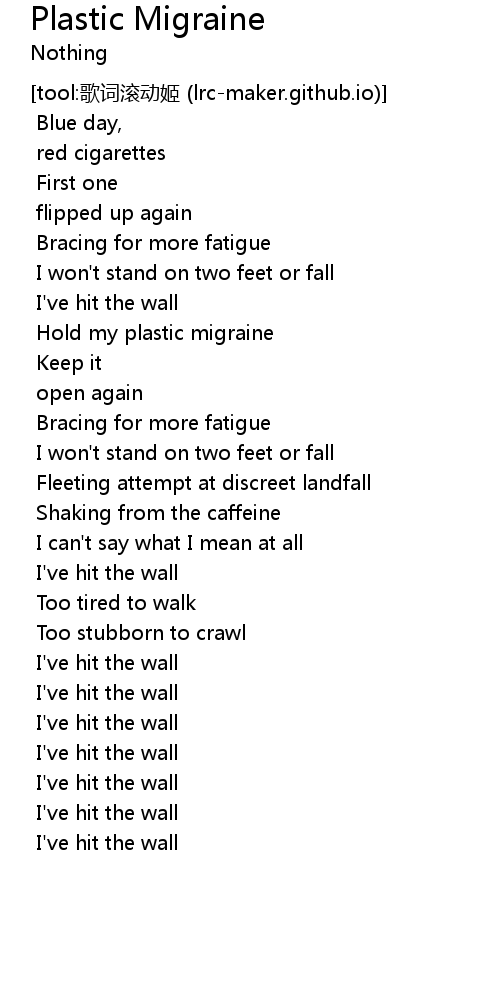 | [01:14.383] | I' ve hit the wall |