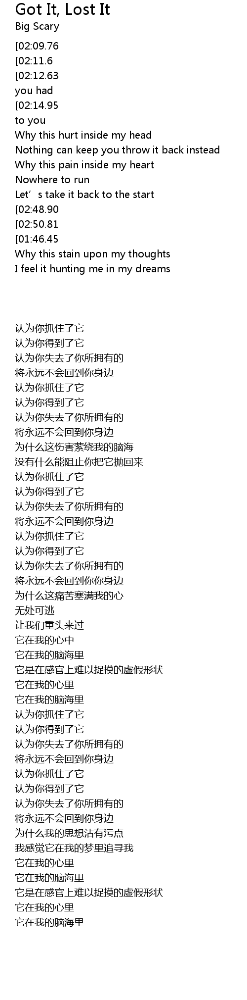 | [02:20.85][02:12.63][01:10.49][01:02.66][00:39.58][00:30.99] | Think you lost what you had |
