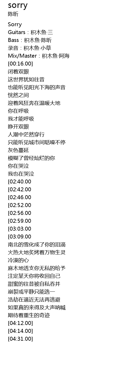 | [01:28.00][02:40.00][03:31.00] | Sorry |