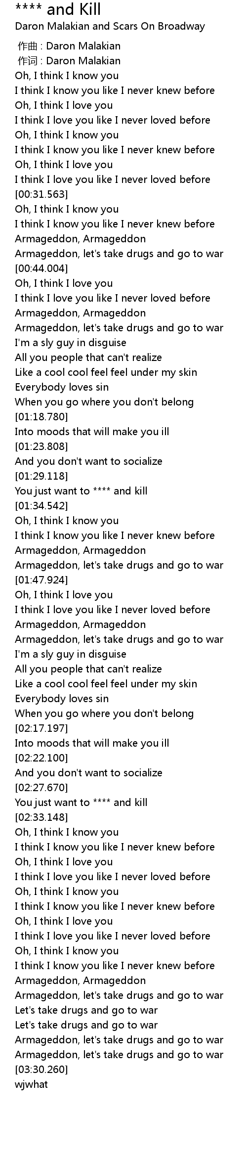 | [01:02.403] | Armageddon, let's take drugs and go to war |