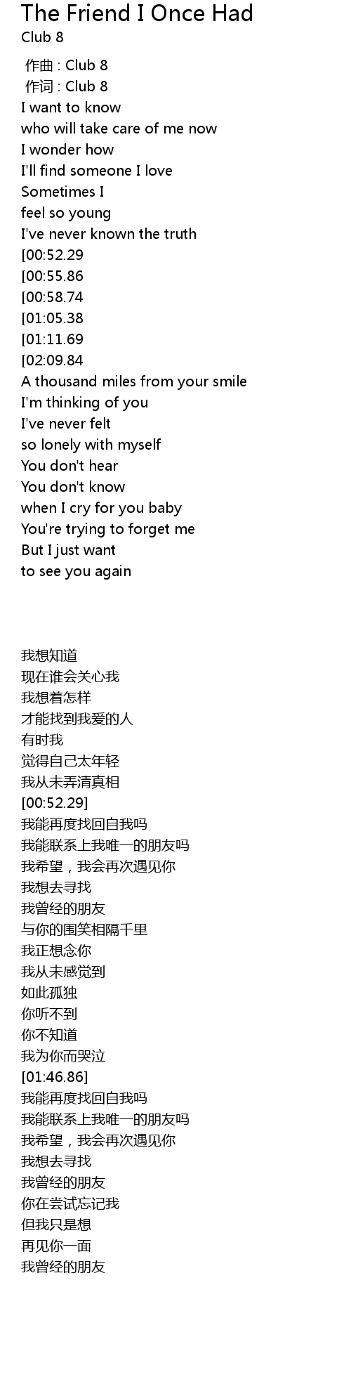 | [02:35.67][02:09.84][01:15.39] | the friend I once had |