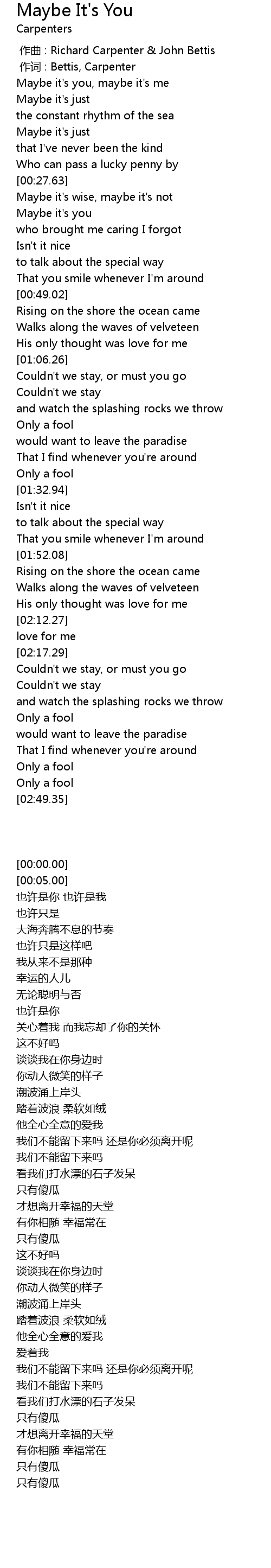 | [00:01.00] | 作词 : Bettis, Carpenter |