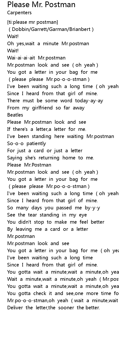 | [00:54.423] | Mr. postman look and see oh yeah |
