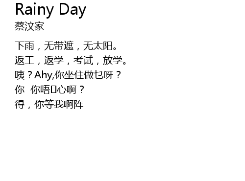 | [00:11.24] | 下雨,无带遮,无太阳。 |