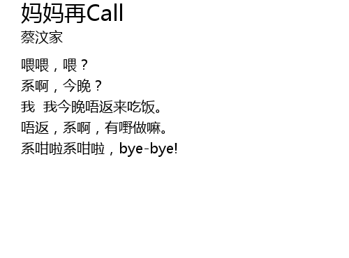 | [00:09.25] | 我 我今晚唔返来吃饭。 |