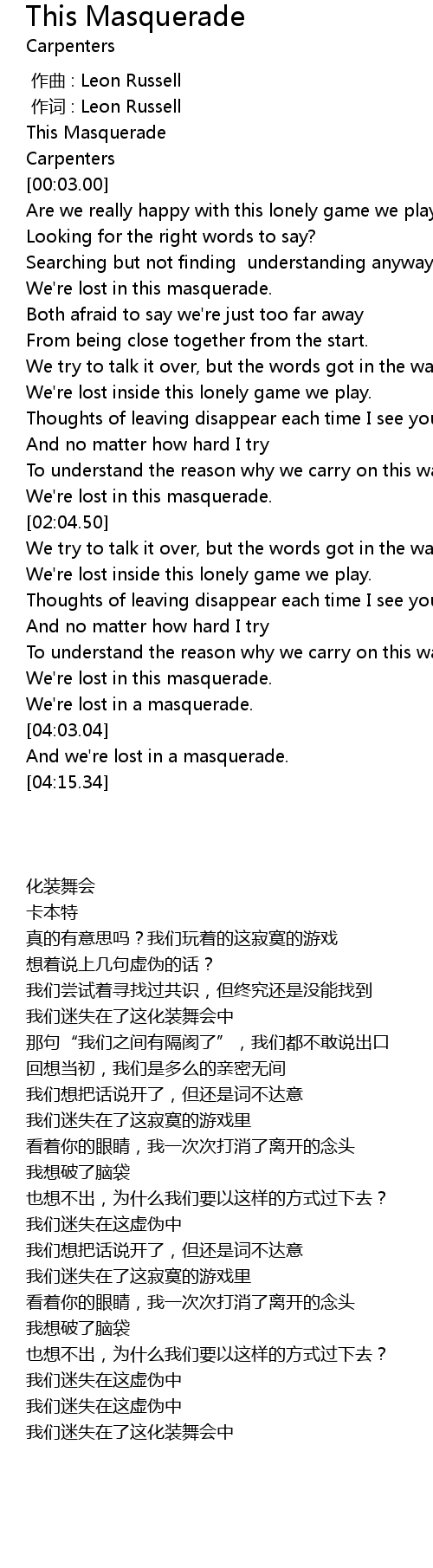 | [03:43.54] | We' re lost in this masquerade. |